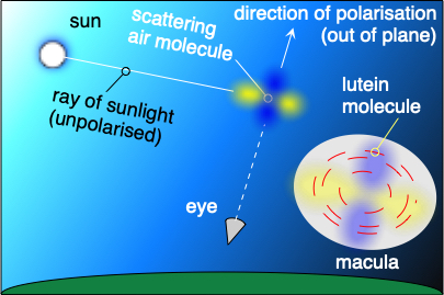 Several decades later this effect became a topic in my electromagnetism course, when I explained the polarisation of Rayleigh scattering. The same mechanism responsible for the blue color of the sky is also responsible for the linear polarisation of the scattered sunlight (see figure). The light vibrates perpendicularly to the plane sun-air-molecule-eye and in that direction the field of view shows a faint blue plume, interrupted by a yellow plume pointing towards the sun. The butterfly shaped object fades quickly, you might think it was just an imagination, but by shifting your gaze it reappears. To distinguish the butterfly from other faint images that may appear on the retina I used the fact that the yellow body of the butterfly does not rotate as you rotate your head: it keeps pointing towards the sun.