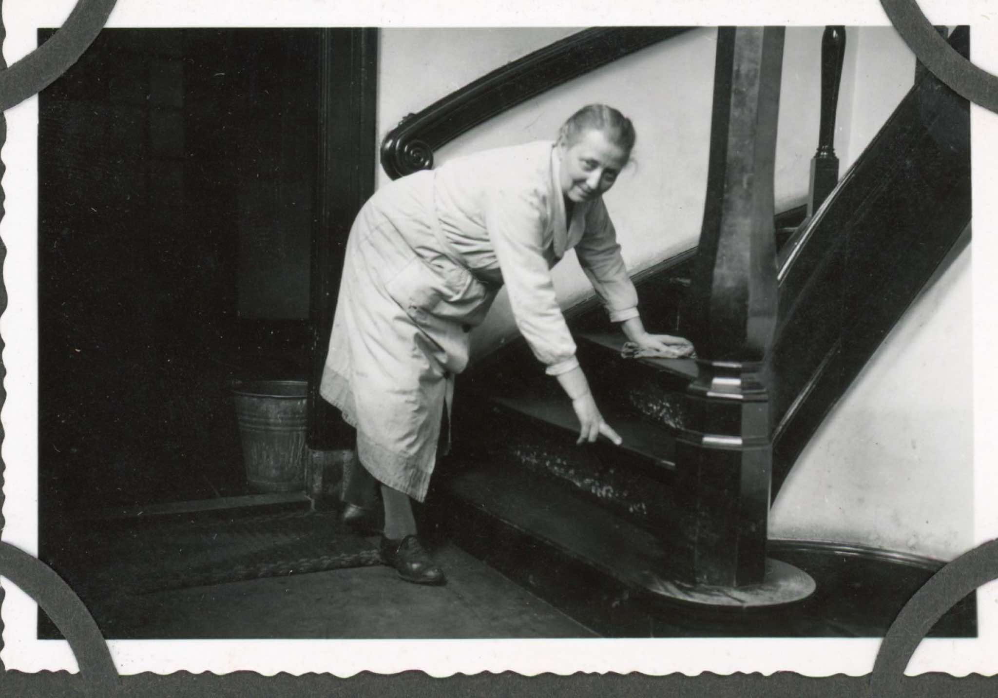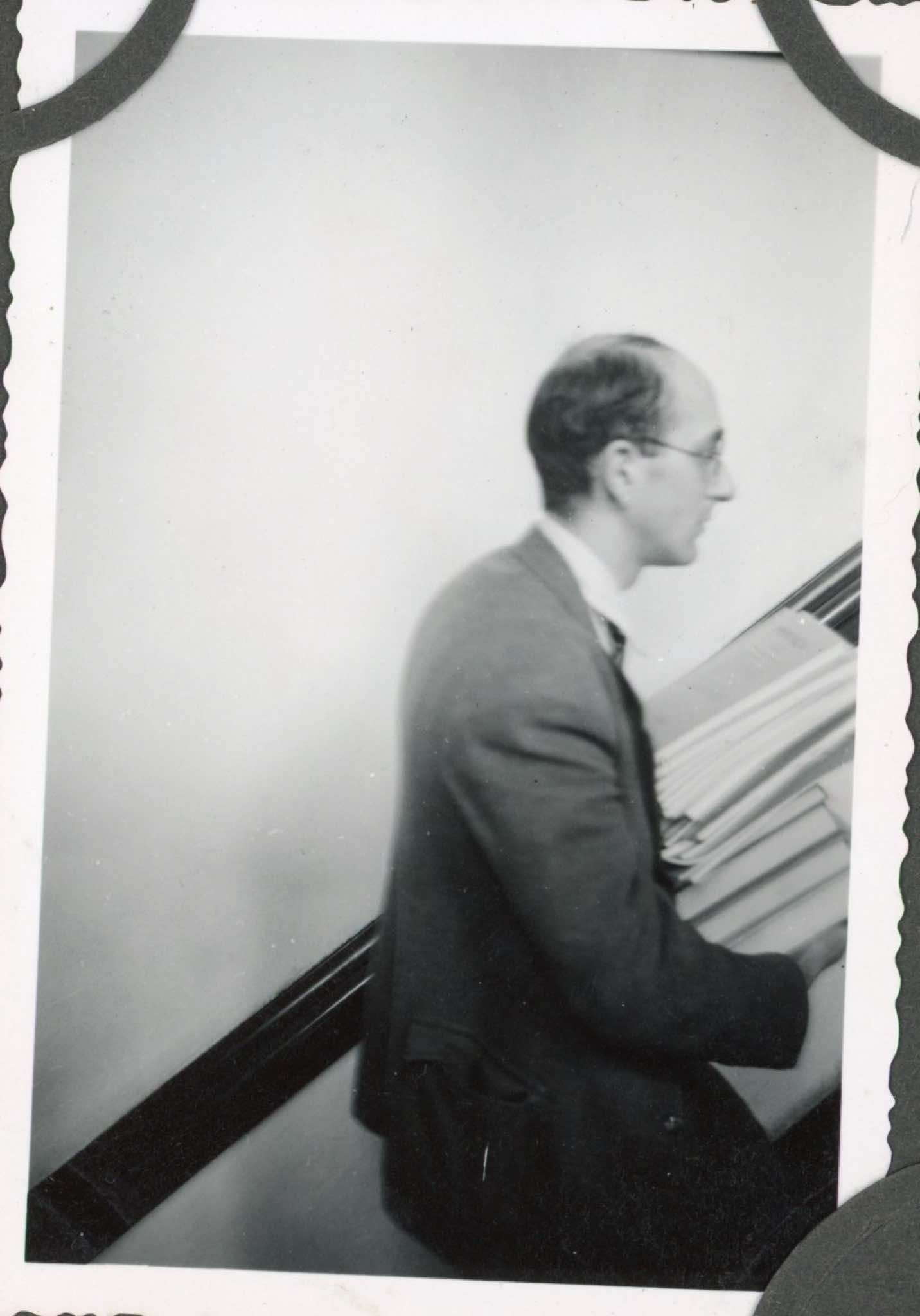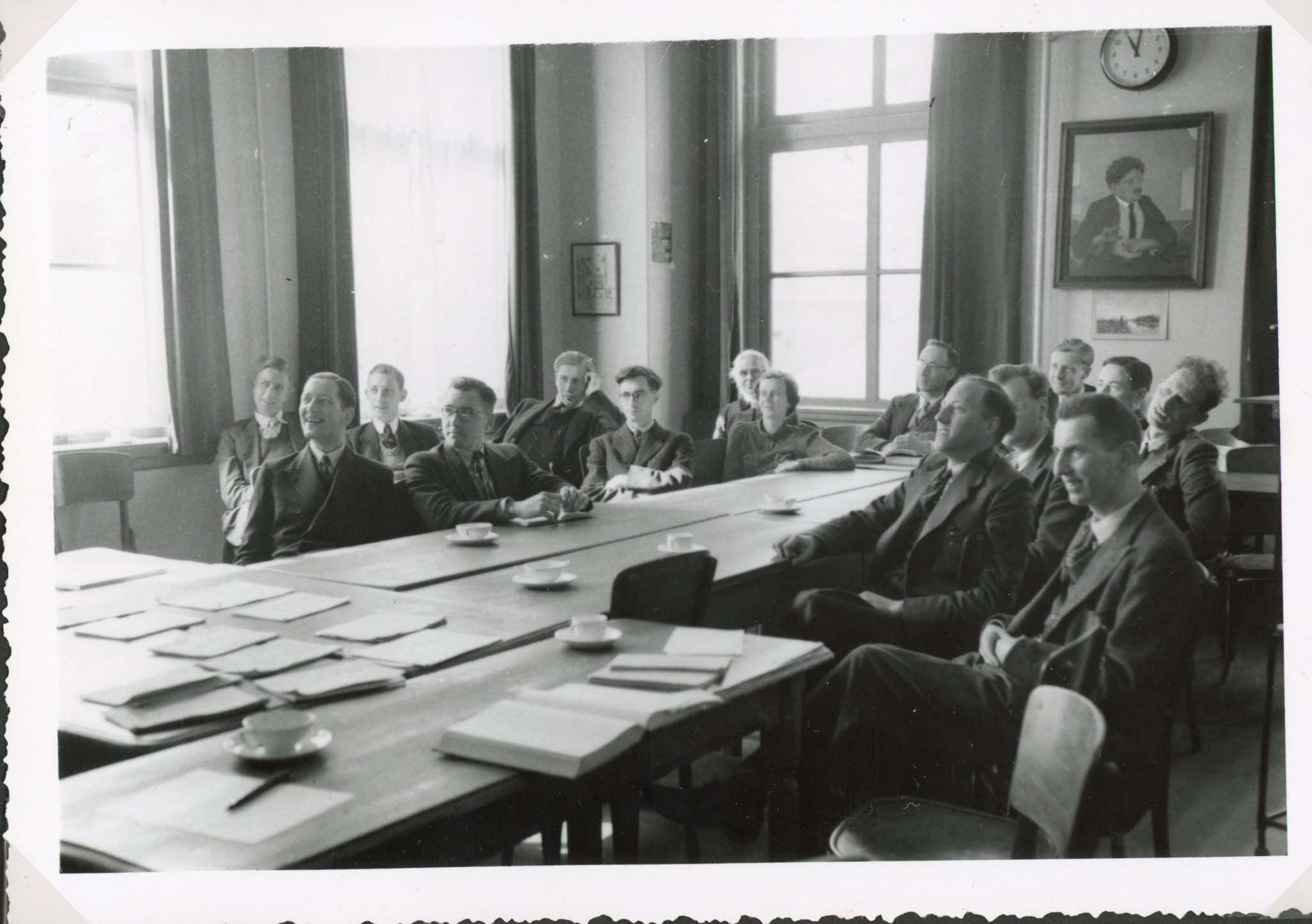 Ehrenfest gathered with his students at the entrance to the institute on Langebrug. The sign above the door says Leeskamer Bosscha ("Bosscha reading room"), in honor of the Leiden physics alumnus Johannes Bosscha. |