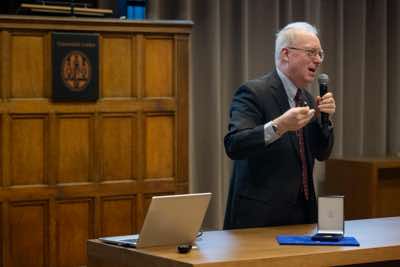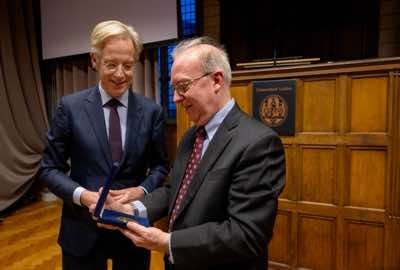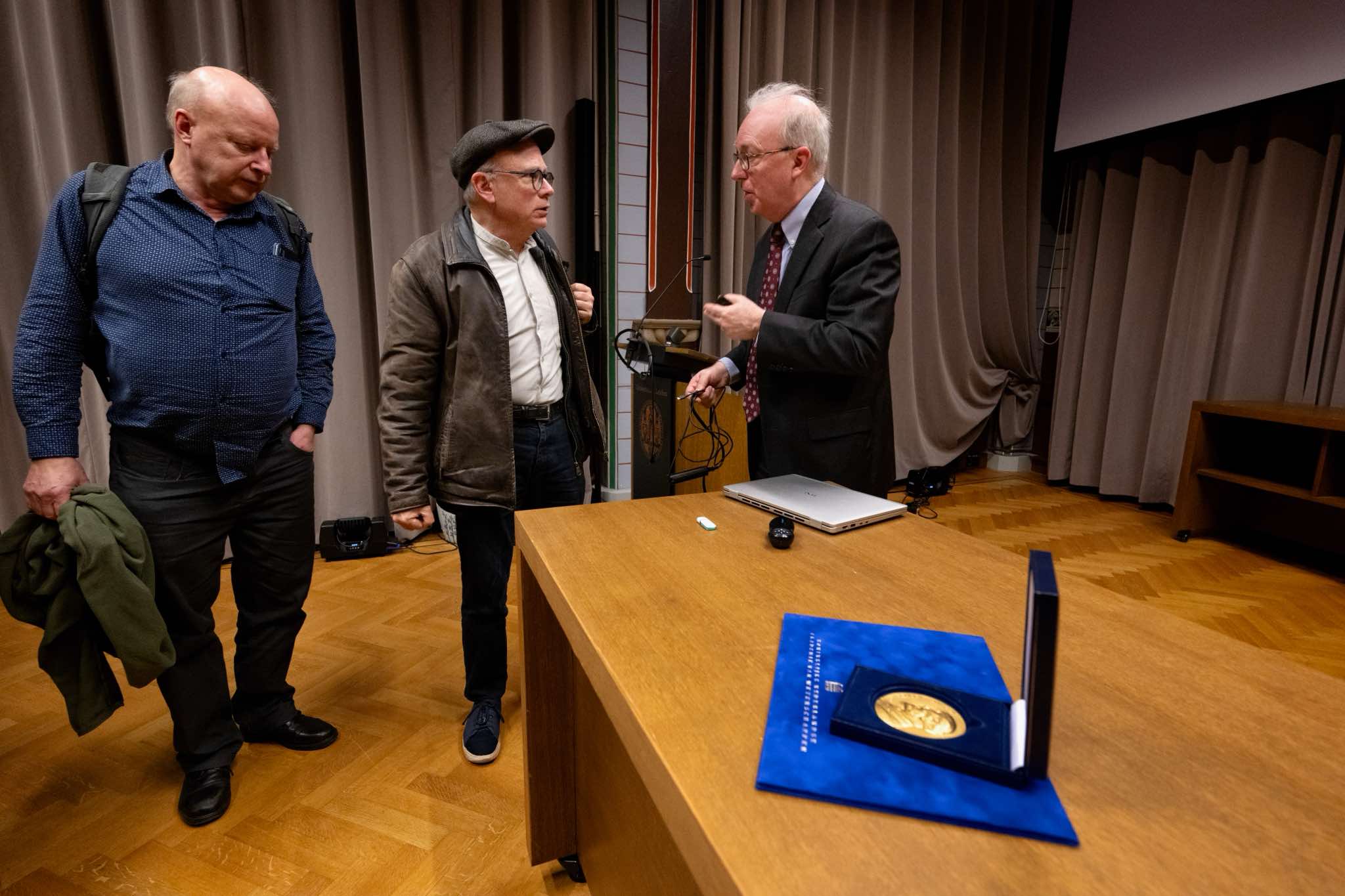 The vice-president of the Royal Netherlands Academy of Arts and Sciences, Lodi Nauta, and the chair of the jury, Robbert Dijkgraaf, hand over the Lorentz Medal to Charles Kane.
