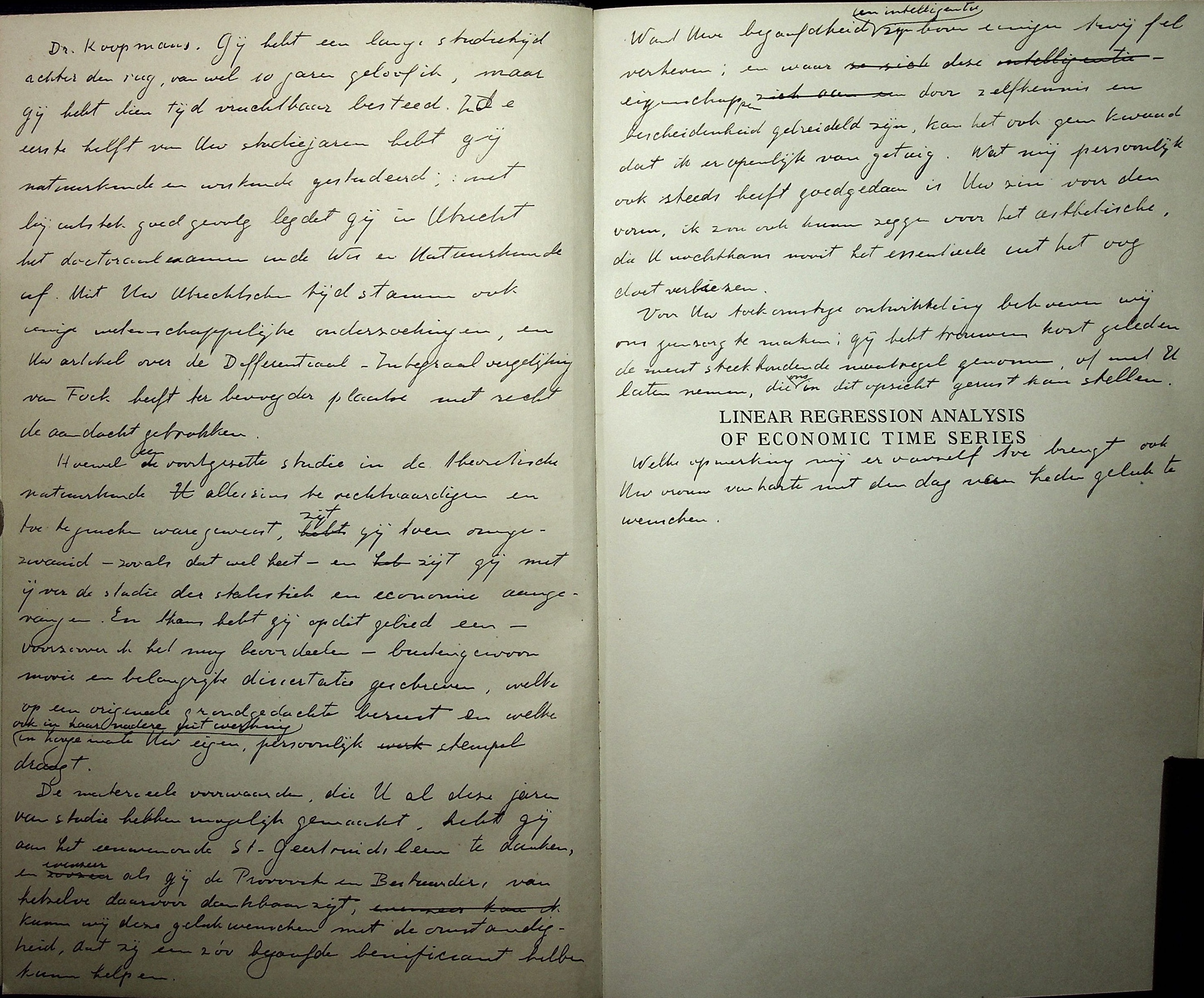Laudatio uitgesproken door H.A. Kramers op 26 november 1936, bij de promotie van Tjalling Koopmans. Dr. Koopmans, gij hebt een lange studietijd achter den rug, van wel 10 jaren geloof ik, maar gij hebt dien tijd vruchtbaar besteed. In de eerste helft van Uw studiejaren hebt gij natuurkunde en wiskunde gestudeerd; met bij uitstek goed gevolg legdet gij in Utrecht het doctoraalexamen in de Wis en Natuurkunde af. Uit Uw Utrechtse tijd stammen ook enige wetenschappelijke onderzoekingen, en Uw artikel over de Differentiaal-Integraalvergelijking van Fock heeft ter bevoegder plaatse met recht de aandacht getrokken. Hoewel een voortgezette studie in de theoretische natuurkunde alleszins te rechtvaardigen en toe te juichen ware geweest, zijt gij toen omgezwaaid – zooals dat wel heet – en zijt gij met ijver de studie der statistiek en economie aangevangen. En thans hebt gij op dit gebied een – voorzover ik het mag beoordelen – buitengewoon mooie en belangrijk dissertatie geschreven, welke op een originele grondgedachte berust en welke ook in haar nadere uitwerking in hooge mate Uw eigen, persoonlijk stempel draagt. De materiele voorwaarden, die U al deze jaren van studie hebben mogelijk gemaakt, hebt gij aan het eeuwenoude St. Geertruidsleen te danken, en evenzeer als gij de Provoosten en Bestuurders van hetzelfve daarvoor dankbaar zijt, kunnen wij deze gelukwenschen met de omstandigheid, dat zij een zoo begaafde beneficiant hebben kunnen helpen. Want Uwe begaafdheid en intelligentie zijn boven enigen twijfel verheven; en waar deze eigenschappen door zelfkennis en bescheidenheid gebreideld zijn, kan het ook geen kwaad dat ik er openlijk van getuig. Wat mij persoonlijk ook steeds heeft goedgedaan is Uw zin voor den vorm, ik zou ook kunnen zeggen voor het aestetische, die U nochthans nooit het essentiele uit het oog doet verliezen. Voor Uw toekomstige ontwikkeling behoeven wij ons geen zorg te maken; gij hebt trouwens kort geleden de meest steekhoudende maatregel genomen, of met U laten nemen, die ons in dit opzicht gerust kan stellen. Welke opmerking mij er vanzelf toe brengt ook Uw vrouw van harte met den dag van heden geluk te wenschen. |