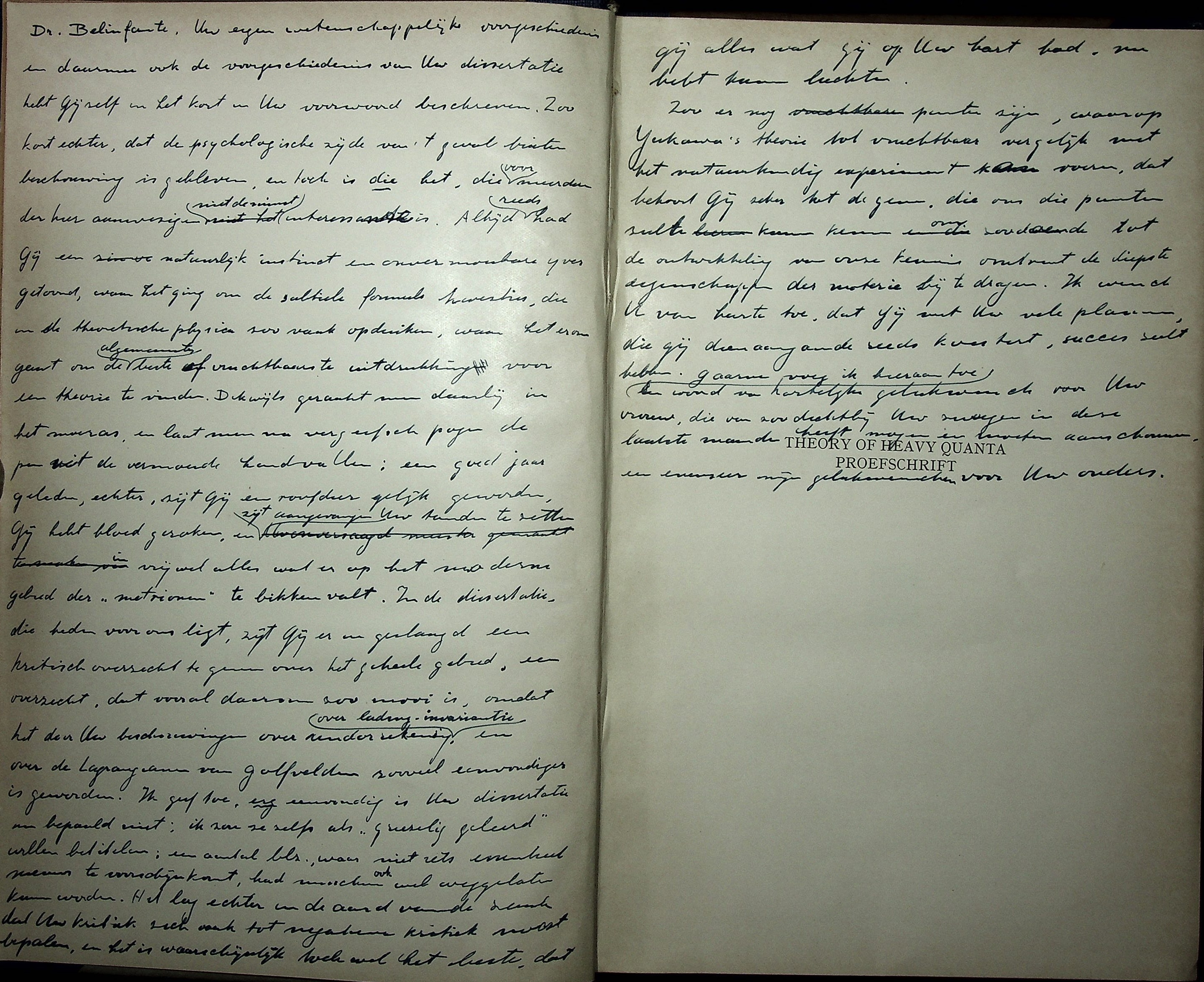 Laudatio uitgesproken door H.A. Kramers op 10 october 1939, bij de promotie van Frederik Jozef Belinfante. Dr. Belinfante, Uw eigen wetenschappelijke voorgeschiedenis en daarmee ook de voorgeschiedenis van Uw dissertatie hebt gijzelf in het kort in Uw voorwoord beschreven. Zoo kort echter, dat de psychologische zijde van 't geval buiten beschouwing is gebleven, en toch is die het, die voor meerderen der hier aanwezigen niet de minst interessante is. Altijd reeds had gij een natuurlijk instinct en overmoeibare ijver getoond, waar het ging om de subtiele formele kwesties, die in de theoretische physica zoo vaak opduiken, waar het er om gaat om de algemeenste, beste of vruchtbaarste uitdrukking voor een theorie te vinden. Dikwijls geraakt men daarbij in het moeras, en laat men na vergeefsch pogen de pen uit de vermoeide hand vallen; een goed jaar geleden, echter, zijt gij een roofdier gelijk geworden, gij hebt bloed geroken, en zijt aangevangen Uw tanden te zetten in vrijwel alles wat er op het moderne gebied der "metrionen" (?) te bikken valt. In de dissertatie, die heden voor ons ligt, zijt gij er in geslaagd een kritisch overzicht te geven over het geheele gebied, een overzicht, dat vooral daarom zoo mooi is, omdat het door uw beschouwingen over undorrekening, over ladings-invariantie en over de Lagrangianen van golfvelden zooveel eenvoudiger is geworden. Ik geef toe, erg eenvoudig is Uw dissertatie nu bepaald niet; ik zou ze zelfs als "griezelig geleerd" willen betitelen; een aantal blz., waar niet iets essentieel nieuws te voorschijn komt, had misschien ook wel weggelaten kunnen worden. Het lag echter in de aard van de zaak dat uw kritiek zich vaak tot negatieve kritiek moest bepalen, en het is waarschijnlijk toch wel het beste, dat gij alles wat gij op Uw hart had, nu hebt kunnen luchten. Zoo er nog punten zijn, waarop Yukawa's theorie tot vruchtbaar vergelijk met het natuurkundig experiment kan voeren, dat(n) behoort gij zeker tot degenen, die ons die punten zullen kunnen kennen (leeren) om zoodoende tot de ontwikkeling van onze kennis omtrent de diepste eigenschappen der materie bij te dragen. Ik wensch U van harte toe, dat gij met Uw vele plannen, die gij dienaangaande reeds koestert, succes zult hebben. Gaarne voeg ik hieraan toe een woord van hartelijke gelukwensch voor Uw vrouw, die van zoo dichtbij uw zwoegen in deze laatste maanden heeft mogen en moeten aanschouwen en evenzeer mijn gelukwenschen voor Uw ouders. |