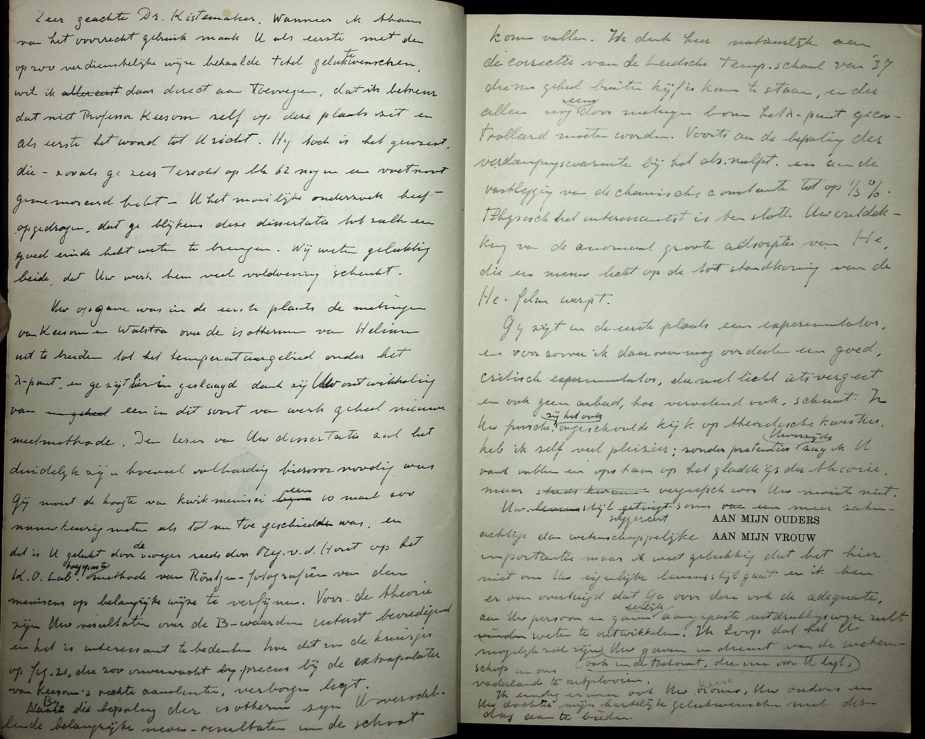 Laudatio uitgesproken door H.A. Kramers op 21 november 1945, bij de promotie van Jacob Kistemaker. Zeer geachte Dr. Kistemaker. Wanneer ik thans van het voorrecht gebruik maak U als eerste met den op zoo verdienstelijke wijze behaalde titel geluk te wenschen, wil ik daar direct aan toevoegen, dat ik betreur dat niet Professor Keesom zelf op deze plaats zit en als eerste het woord tot U richt. Hij toch is het geweest, die – zooals ge zeer terecht op blz. 62 nog in een voetnoot gememoreerd hebt – U het moeilijke onderzoek heeft opgedragen, dat ge blijkens deze dissertatie tot zulk een goed einde hebt weten te brengen. Wij weten gelukkig beide, dat Uw werk hem veel voldoening schenkt. Uw opgave was in de eerste plaats de metingen van Keesom en Walstra over de isothermen van Helium uit te breiden tot het temperatuurgebied onder het lambda-punt, en ge zij hier in geslaagd dank zij Uw ontwikkeling van een in dit soort van werk geheel nieuwe meetmethode. Den lezer van Uw dissertatie zal het duidelijk zijn hoeveel volharding hiervoor noodig was. Gij moest de hoogte van kwik menisci een 10 maal zoo nauwkeurig meten als tot nu toe geschied was, en dat is U gelukt door de vroeger reeds door Mej. v.d. Horst op het K.O. lab. toegepaste methode van Röntgenfotografiën van den meniscus op belangrijke wijze te verfijnen. Voor de theorie zijn uw resultaten van de B-waarden uiterst bevredigend en het is interessant te bedenken hoe dit in de kruisjes op fig. 21, die zoo onverwacht precies bij de extrapolatie van Keesom's rechte aansluiten, verborgen ligt. Bij die bepaling der isothermen zijn U verschillende belangrijk neven-resultaten in de schoot komen vallen. Ik denk hier natuurlijk aan de correctie van de Leidsche temp. schaal van '37 die nu geheel buiten kijf is komen te staan, en die alleen nog eens door metingen boven het lambda-punt gecontrolleerd moeten worden. Voorts aan de bepaling der verdampingswarmte bij het abs. nulp. en aan de vastlegging van de chemische constante tot op 1/3 %. Physisch het interessants is ten slotte Uw ontdekking van de anomaal groote adsorptie van He, die een nieuw licht op de tot standkoming van de He-film werpt. Gij zijt in de eerste plaats een experimentator, en voor zoover ik daar over mag oordeelen een goed, critisch experimentator, die niet licht iets vergeet en ook geen arbeid, hoe vervelend ook, schuwt. In Uw frissche, zij het ook ongeschoolde kijk op theoretische kwesties, heb ik zelf veel pleizier; zonder pretenties Uwerzijds zag ik U vaak vallen en opstaan op het gladde ijs der theorie, maar vergeefsch was Uw moeite niet. Uw stijl suggereert soms een meer zakenachtige dan wetenschappelijke importantie maar ik weet gelukkig dat het hier niet om Uw eigenlijke levensstijl gaat en ik ben er van overtuigd dat ge voor deze ook de adequate, aan Uw persoon en gaven eerlijk aangepaste uitdrukkingswijze zult weten te ontwikkelen. Ik hoop dat het u mogelijk zal zijn ook in de toekomst, die nu voor U ligt, Uw gaven in dienst van de wetenschap in ons vaderland te ontplooien. Ik eindig ermee ook Uw vrouw, Uw ouders en Uw dochter mijn hartelijke gelukwenschen met deze dag aan te bieden. |
