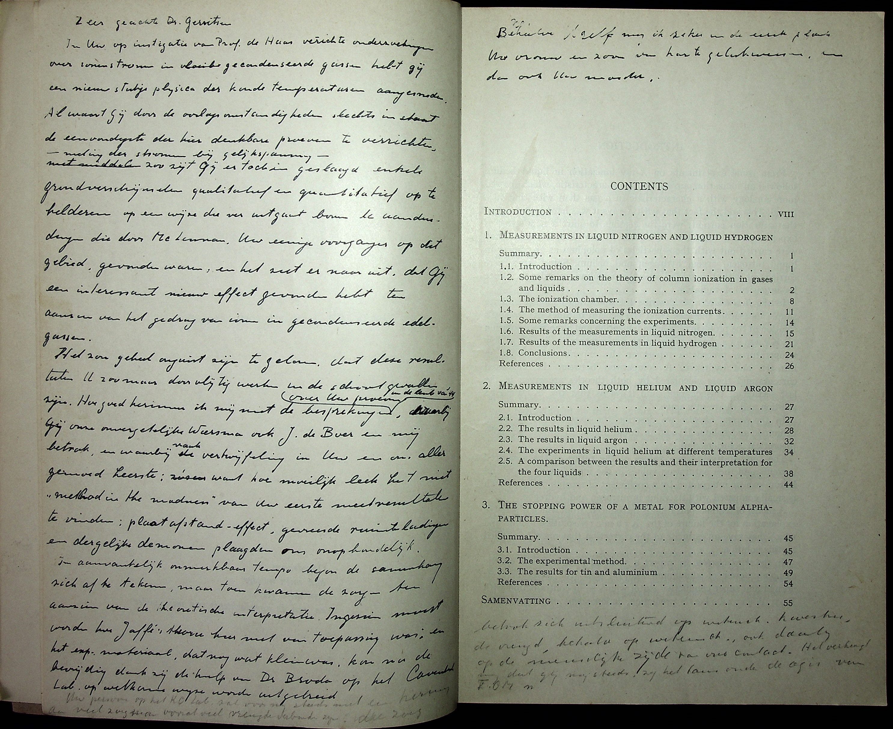Laudatio uitgesproken door H.A. Kramers op 30 juni 1948, bij de promotie van Alexander Nicolaas Gerritsen. In Uw op instigatie van Prof. de Haas verrichte onderzoekingen over ionenstromen in gecondenseerde gassen hebt gij een nieuw stukje physica der koude temperaturen aangesneden. Al waart gij door de oorlogsomstandigheden slechts in staat de eenvoudigste der hier denkbare proeven te verrichten – meting der stromen bij gelijkspanning &ndash zoo zijt gij er toch in geslaagd enkele grondverschijnselen qualitatief en quantitatief op te helderen op een wijze die ver uitgaat boven de aanduidingen die door McLennan, Uw eenige voorganger op dit gebied, gevonden waren; en het ziet er naar uit, dat gij een interessant nieuw effect gevonden hebt ten aanzien van het gedrag van ionen in gecondenseerde edelgassen. Het zou geheel onjuist zijn te geloven, dat deze resultaten U zoomaar door vlijtig werken in de schoot gevallen zijn. Hoe goed herinner ik mij niet de besprekingen over Uw proeven in de lente van '44, waarbij onze onvergetelijke Wiersma ook J. de Boer en mij betrok, en waarbij vaak vertwijfeling in Uw en ons aller gemoed heerste; want hoe moeilijk leek het niet "method in the madness" van Uw eerste meetresultaten te vinden; plaat-afstand-effect, gevreesde ruimteladingen en dergelijke demonen plaagden ons onophoudelijk. In aanvankelijk onmerkbaar tempo begon de samenhang zich af te tekenen, maar toen kwamen de zorgen ten aanzien van de theoretische interpretatie. Ingezien moest worden hoe Jaffe's theorie hier niet van toepassing was; en het exp. materiaal, dat nog wat klein was, kon na de bevrijding dank zij de hulp van Dr. Broda op het Cavendish Lab. op welkome wijze worden uitgebreid. Uw persoon op het K.O. Lab. zal voor mij steeds met een herinnering aan veel zorg maar vooral veel vreugde verbonden zijn; die zorg betrok zich uitsluitend op wetensch. kwesties, de vreugd, behalve op wetensch. ook daarbij op de menschelijke zijde van ons contact. Het verheugt mij dat gij nog steeds, zij het thans onder de aegis van F.O.M. ... Behalve Uzelf mag ik zeker in de eerste plaats Uw vrouw en zoon van harte gelukwensen, en dan ook Uw moeder. |