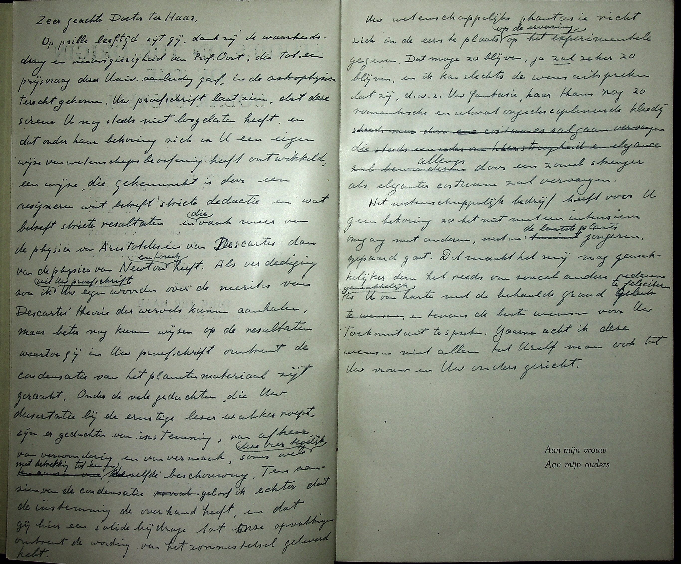 Laudatio uitgesproken door H.A. Kramers op 22 september 1948, bij de promotie van Dirk ter Haar. Zeer geachte Doctor ter Haar. Op prille leeftijd zijt gij, dank zij de waarheidsdrang en nieuwsgierigheid van Prof. Oort, die tot een prijvraag dezer Univ. aanleiding gaf, in de astrophysica terecht gekomen. Uw proefschrift laat zien, dat deze sirene U nog steeds niet losgelaten heeft, en dat onder haar bekoring zich in U een eigen wijze van wetenschapsbeoefening heeft ontwikkeld, een wijze, die gekenmerkt is door een resigneren wat betreft stricte deductie en wat betreft stricte resultaten en die vaak meer van de physica van Aristoteles en van Descartes dan van de physica van Newton en Lorentz heeft. Als verdediging zou ik uit Uw proefschrift Uw eigen woorden over de merites van Descartes' theorie der wervels kunnen aanhalen, maar beter nog kunnen wijzen op de resultaten waartoe gij in Uw proefschrift omtrent de condensatie van het planetenmateriaal zijt geraakt. Onder de vele gedachten, die Uw dissertatie bij de ernstige lezer wakker roept, zijn er gedachten van instemming, van afkeer, van verwondering en van vermaak, soms wel deze vier tegelijk met betrekking to een en dezelfde beschouwing. Ten aanzien van de condensatie geloof ik echter dat de instemming de overhand heeft, en dat gij hier een solide bijdrage tot onze opvattingen omtrent de wording van het zonnestelsel geleverd hebt. Uw wetenschappelijke phantasie richt zich in de eerste plaats op de ervaring, op het experimentele gegeven. Dat moge zo blijven, ja zal zeker zo blijven, en ik kan slechts de wens uitspreken dat zij, d.w.z. Uw fantasie, haar thans nog zo romantische en ietwat ongedisciplineerde kleedij allengs door een zowel strenger als eleganter costuum zal vervangen. Het wetenschappelijk bedrijf heeft voor U geen bekoring zo het niet met een intensieve omgang met anderen, niet in de laatste plaats jongeren, gepaard gaat. Dit maakt het mij nog gemakkelijker dan het reeds om zoveel andere redenen gemakkelijk is U van harte met de behaalde graad te feliciteren en tevens de beste wensen voor Uw toekomst uit te spreken. Gaarne acht ik deze wensen niet alleen tot Uzelf maar ook tot Uw vrouw en Uw ouders gericht. |