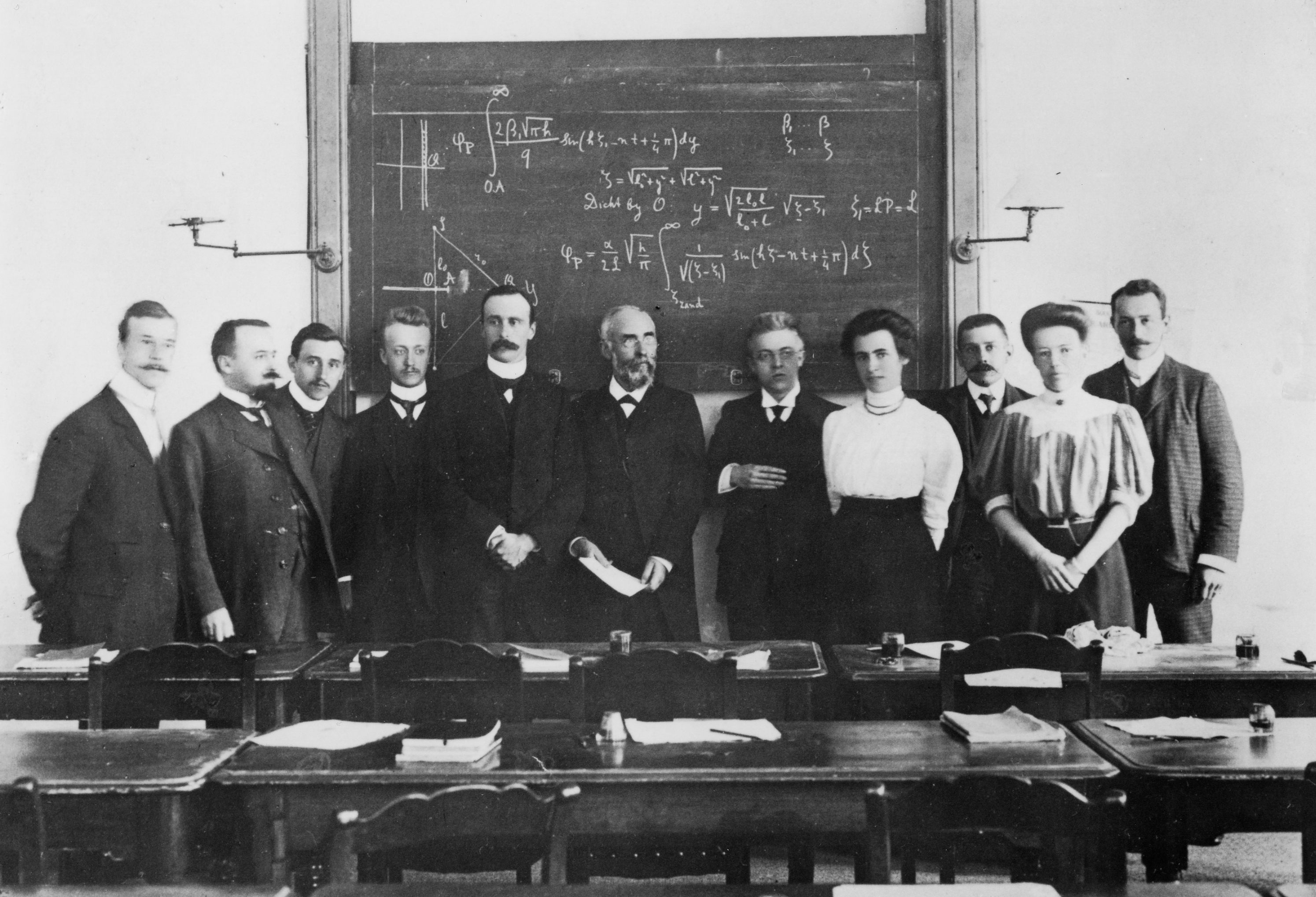 Lorentz and his Monday morning lecture class, around 1910. To the right of Lorentz stand his Ph.D. students Droste, de Haas-Lorentz (also his daughter), and Bruins (front). To his left stand Vollgraff and Bremekamp. (More on this photograph, also here and here).