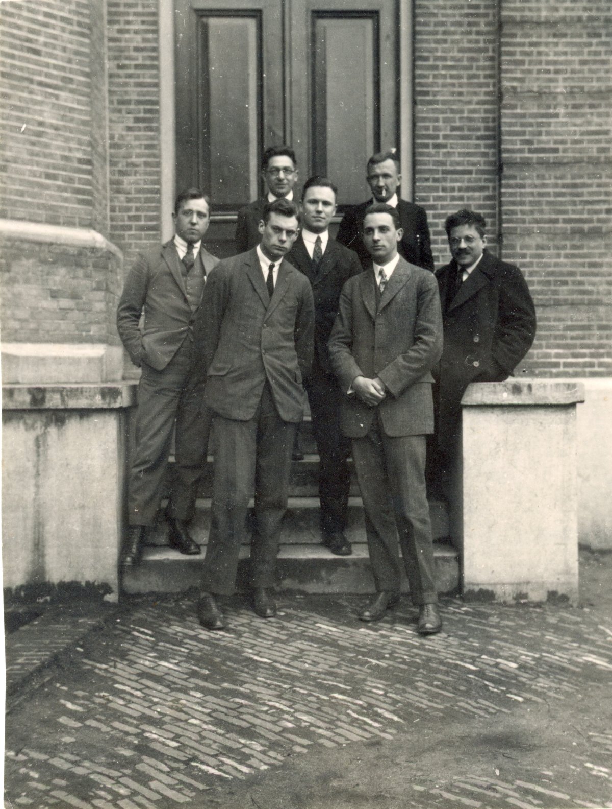 This photograph is similar in setting to the iconic 1927 photograph showing Dirac and Oppenheim. I had hoped that it might show Fermi next to Ehrenfest, but Jos Engelen kindly corrected me (it's Kronig). Comparison with the 1927 photo helps to identify some individuals, any help with the others is much appreciated.