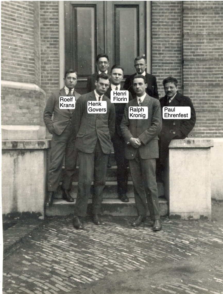 - The photograph above shows Fermi and Kronig with Ehrenfest and three of his students: Goudsmit would share with Uhlenbeck and Kronig in the discovery of the electron spin, as he recalls here. Tinbergen did his Ph.D. with Ehrenfest on a topic at the interface of physics and economy, and would eventually become the first Nobel laureate in economy. Dieke became one of the world's foremost experts in spectroscopy.