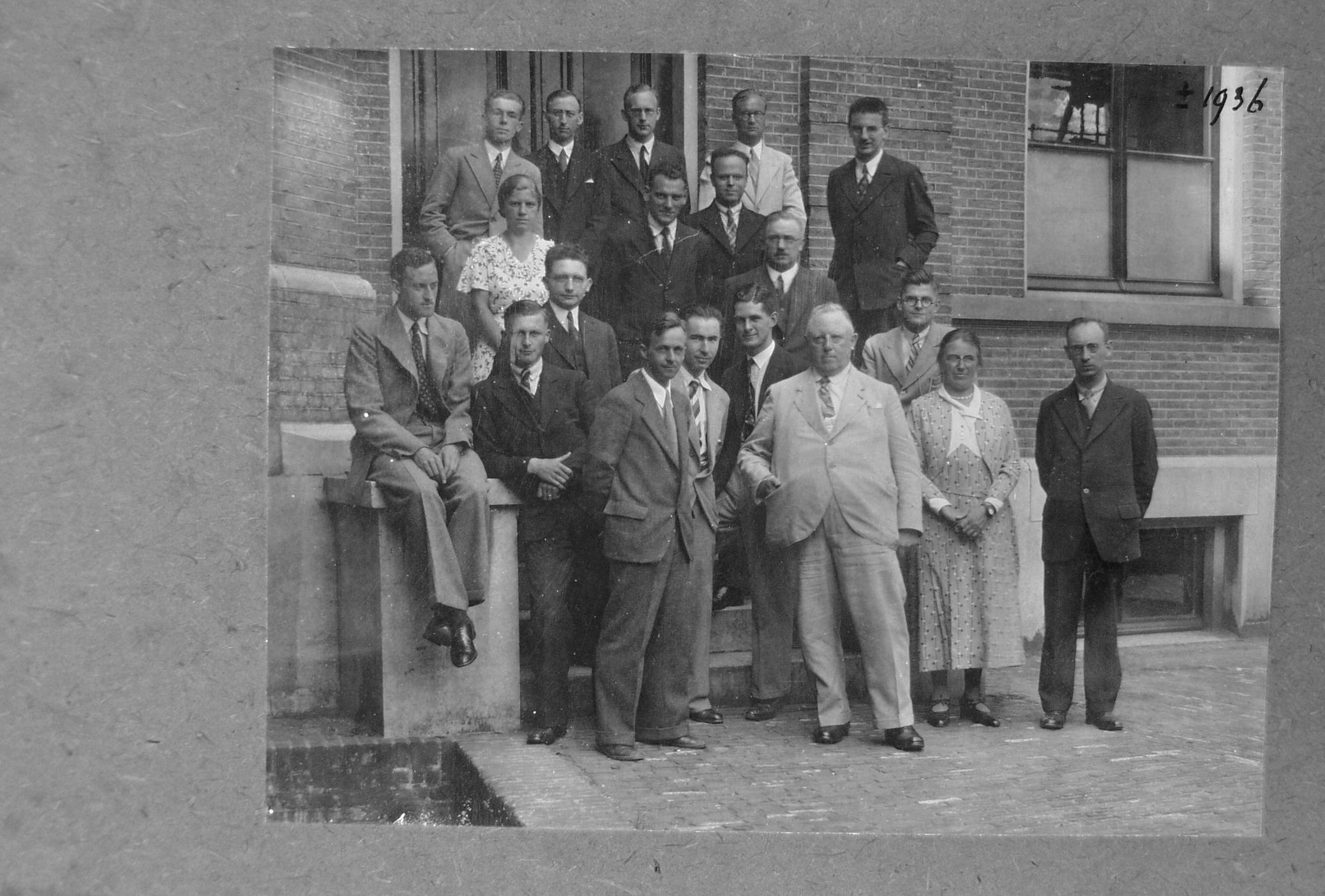 Afscheid Clark 1935. Keesom, Clark en assistenten.