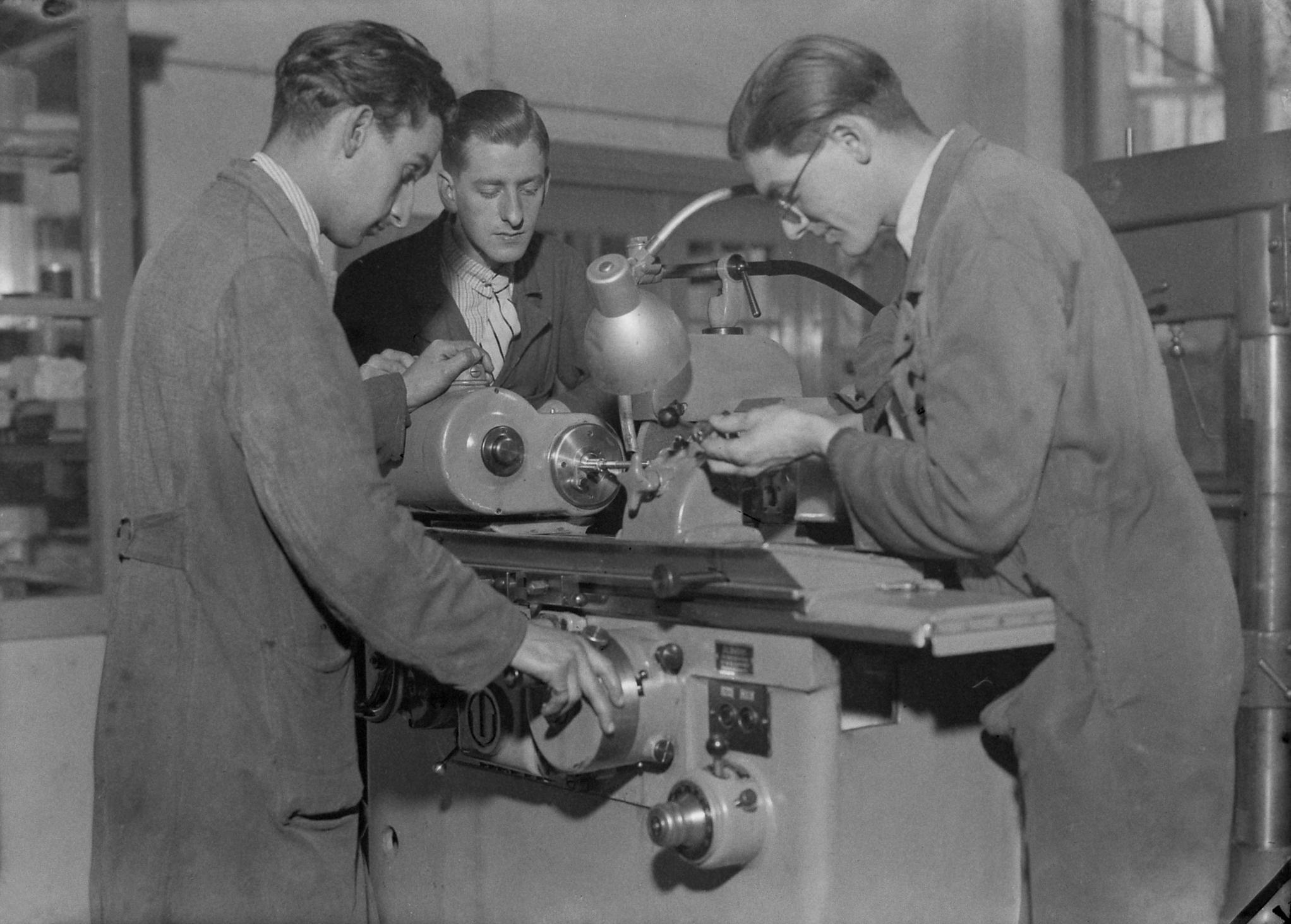 v.l.n.r. Nater met leerlingen Bik, Lieshout in nieuwe werkplaats. 1944