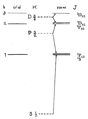 The old and the new term scheme of hydrogen [5]. The scheme shows the multiplet splitting of the excited states of the hydrogen atom with principal quantum number n=3, presented by Goudsmit in the form in which it appeared in the original publications of1926. The assignment in the current notation has been added at the right. With the development of quantum mechanics the notation changed. The quantum numbers L and J now usedfor the orbital and total angular momentum, respectively, correspond to K-1/2 and J-1/2 in the figure. The "forbidden component" referred to by Goudsmit is of the type 3 2P1/2 --> 2 2S in which the total angular momentum is conserved and L changes by plus or minus 1.