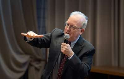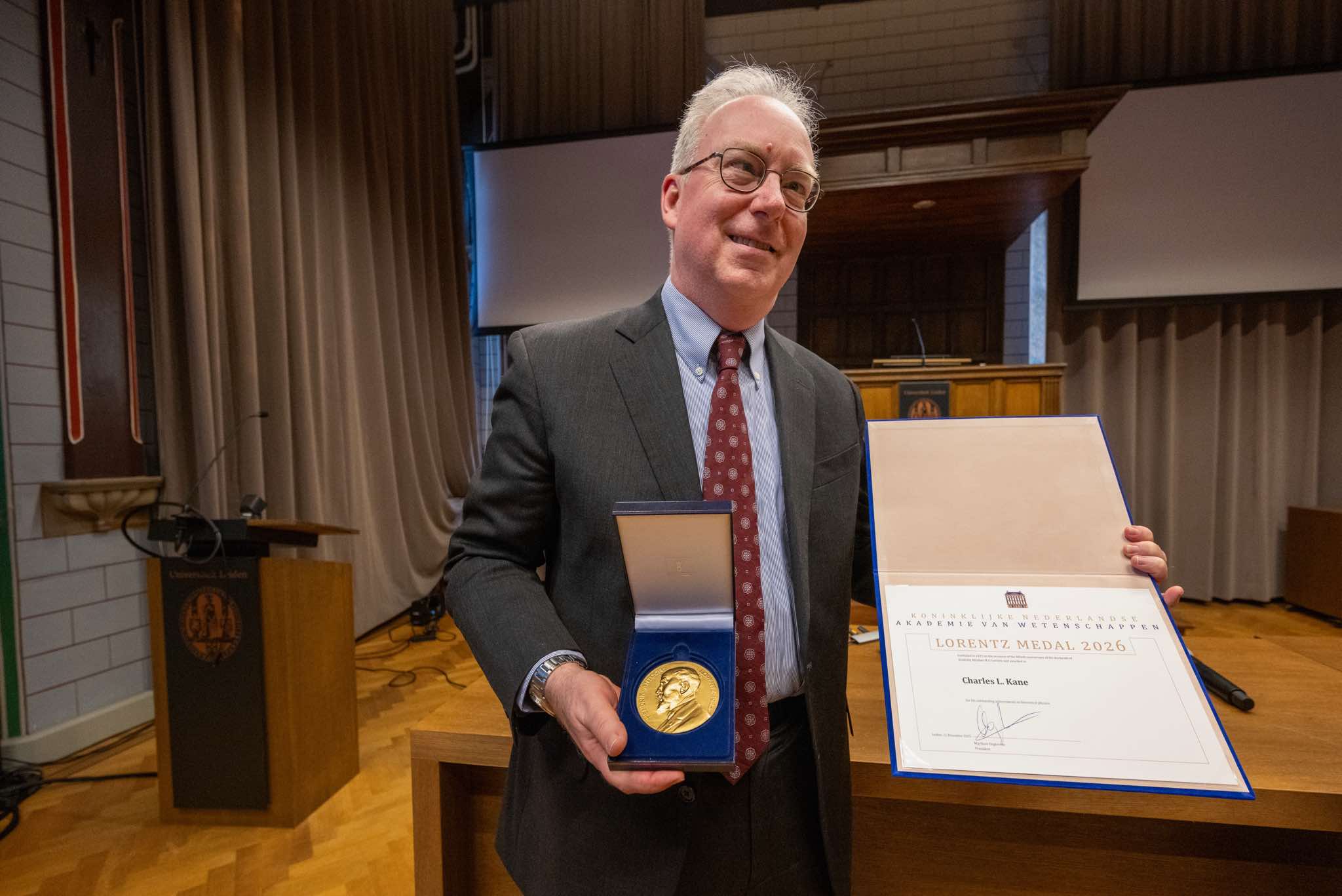 The vice-president of the Royal Netherlands Academy of Arts and Sciences, Lodi Nauta, and the chair of the jury, Robbert Dijkgraaf, hand over the Lorentz Medal to Charles Kane.