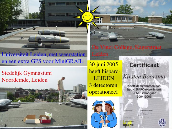 Update Juni 2005: In juni is er hard gewerkt om alle detectoren aan te sluiten. Op 21 juni is de detector van het Stedelijk Gymnasium op hun gebouw aan het Noordeinde geplaatst (met speciale dank aan Pim, Henk en Bert!) en op 29 juni is op het Da Vinci college een gat door dak en vloer aangebracht voor de kabels. Op 30 juni stuurden alle drie de detectoren van de Leidse HiSPARC-cluster voor het eerst tegelijk hun data naar de NiKHEF server.