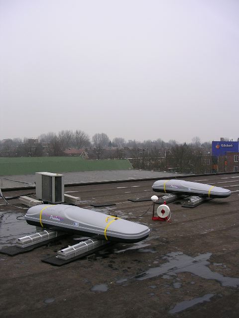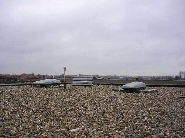 Update Maart 2006: In Alphen a/d Rijn is de eeste detector op 1 maart geinstaleerd op het dak van het Scala, maar deze werd in Amsterdam gebouwd. Op 15 maart kon onze detector op het dak van het Groene Hart Lyceum worden geplaats. Hieronder ziet U de foto.