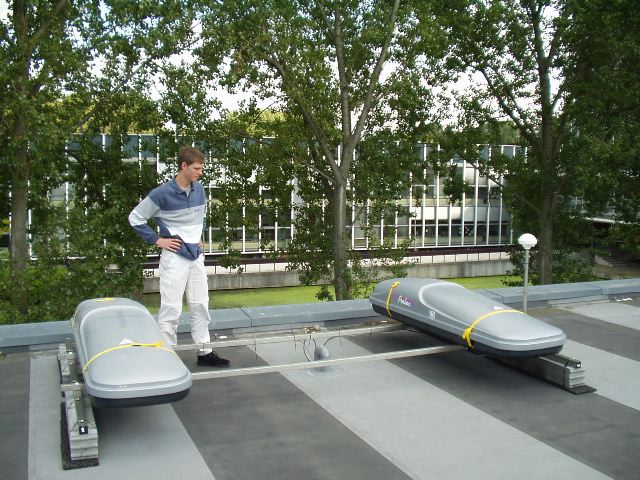 Update Juni 2004: We hebben wat vertraging opgelopen door het wachten op de toestemming om onze HiSparc detector op het dak boven MiniGRAIL te plaatsen. Tijdelijk is de HiSparc detector nu binnen de meethal opgesteld -- één onder en één boven de MiniGRAIL detector.
