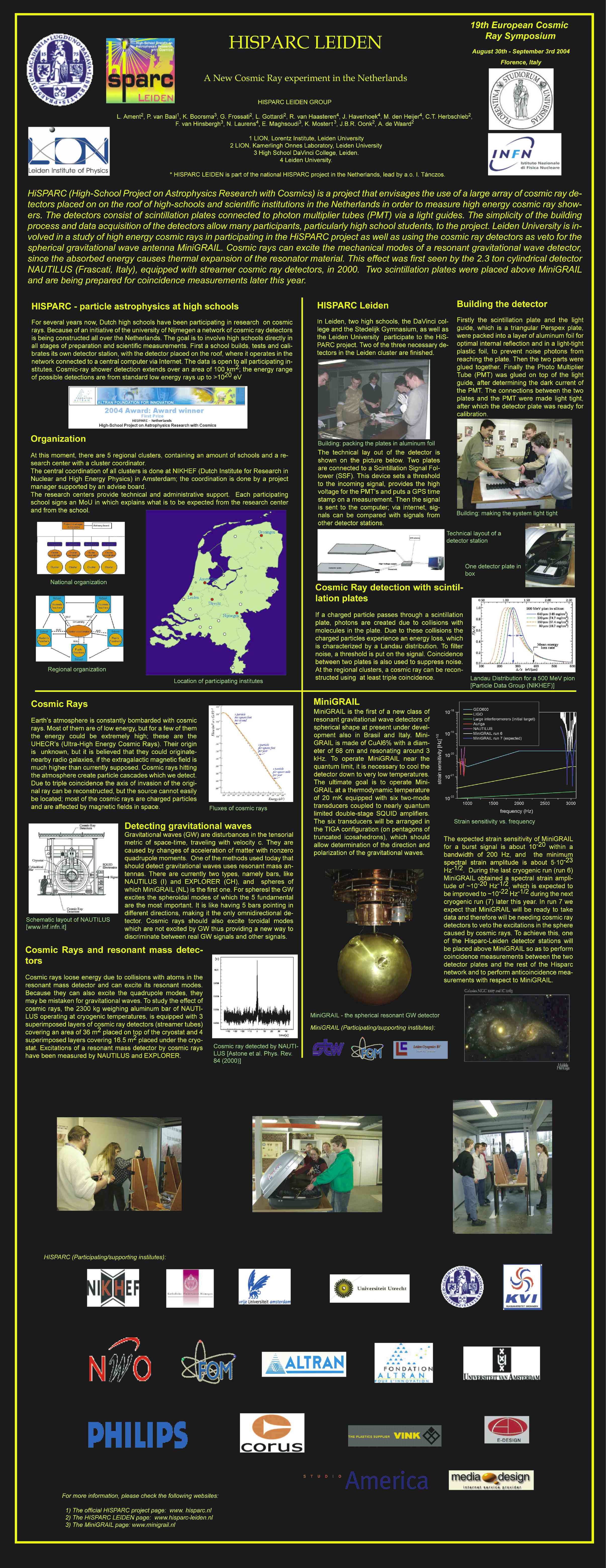 Update Novermber 2004: Het tijdschrift Natuur en Techniek heeft in haar November nummer een artikel over HiSPARC geplaatst. Vanaf midden november meet de MiniGRAIL detector, alsmede onze erboven opgestelde HiSPARC detector (we sturen tijdelijk onze data naar Nijmegen, met dank aan Charles Timmermans voor zijn hulp).